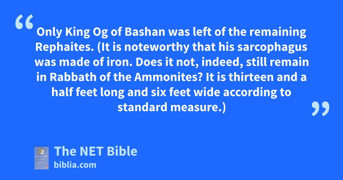 3:1 Next we set out on1 the route to Bashan,2 but King Og of Bashan and his whole army3 came out to meet us in battle at Edrei.4 3:2 The Lord, however, said to me, “Don’t be afraid of him because I have already given him, his whole army,5 and his land to you. You will do to him exactly what you did to King Sihon of the Amorites who lived in Heshbon.” 3:3 So the Lord our God did indeed give over to us King Og of Bashan and his whole army and we struck them down until not a single survivor was left.6 3:4 We captured all his cities at that time—there was not a town we did not take from them—sixty cities, all the region of Argob,7 the dominion of Og in Bashan. 3:5 All of these cities were fortified by high walls, gates, and locking bars;8 in addition there were a great many open villages.9 3:6 We put all of these under divine judgment10 just as we had done to King Sihon of Heshbon—every occupied city,11 including women and children. 3:7 But all the livestock and plunder from the cities we kept for ourselves. 3:8 So at that time we took the land of the two Amorite kings in the Transjordan from Wadi Arnon to Mount Hermon12 3:9 (the Sidonians13 call Hermon Sirion14 and the Amorites call it Senir),15 3:10 all the cities of the plateau, all of Gilead and Bashan as far as Salecah16 and Edrei,17 cities of the kingdom of Og in Bashan. 3:11 Only King Og of Bashan was left of the remaining Rephaites. (It is noteworthy18 that his sarcophagus19 was made of iron.20 Does it not, indeed, still remain in Rabbath21 of the Ammonites? It is thirteen and a half feet22 long and six feet23 wide according to standard measure.)24