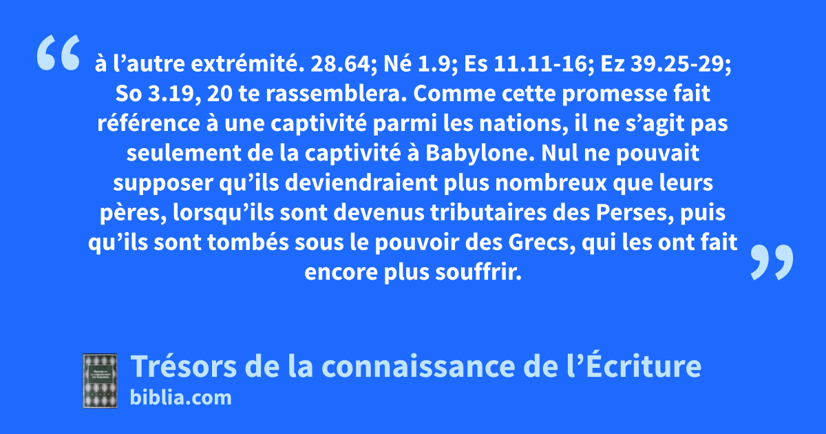 à l’autre extrémité. 28.64; Né 1.9; Es 11.11-16; Ez 39.25-29; So 3.19, 20 te rassemblera. Comme cette promesse fait référence à une captivité parmi les nations, il ne s’agit pas seulement de la captivité à Babylone. Nul ne pouvait supposer qu’ils deviendraient plus nombreux que leurs pères, lorsqu’ils sont devenus tributaires des Perses, puis qu’ils sont tombés sous le pouvoir des Grecs, qui les ont fait encore plus souffrir.