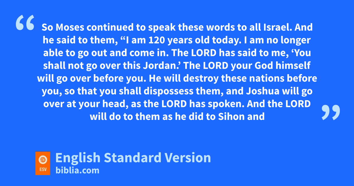 31 So Moses continued to speak these words to all Israel. 2 And he said to them, “I am d120 years old today. I am no longer able to ego out and come in. The Lord has said to me, f‘You shall not go over this Jordan.’ 3 The Lord your God ghimself will go over before you. He will destroy these nations before you, so that you shall dispossess them, and Joshua will go over at your head, has the Lord has spoken. 4 And the Lord will do to them ias he did to Sihon jand Og, the kings of the Amorites, and to their land, when he destroyed them. 5 And the Lord will give them over to you, and you shall do to them kaccording to the whole commandment that I have commanded you. 6 lBe strong and courageous. Do not fear or be in dread of them, mfor it is the Lord your God who goes with you. nHe will not leave you or forsake you.”
