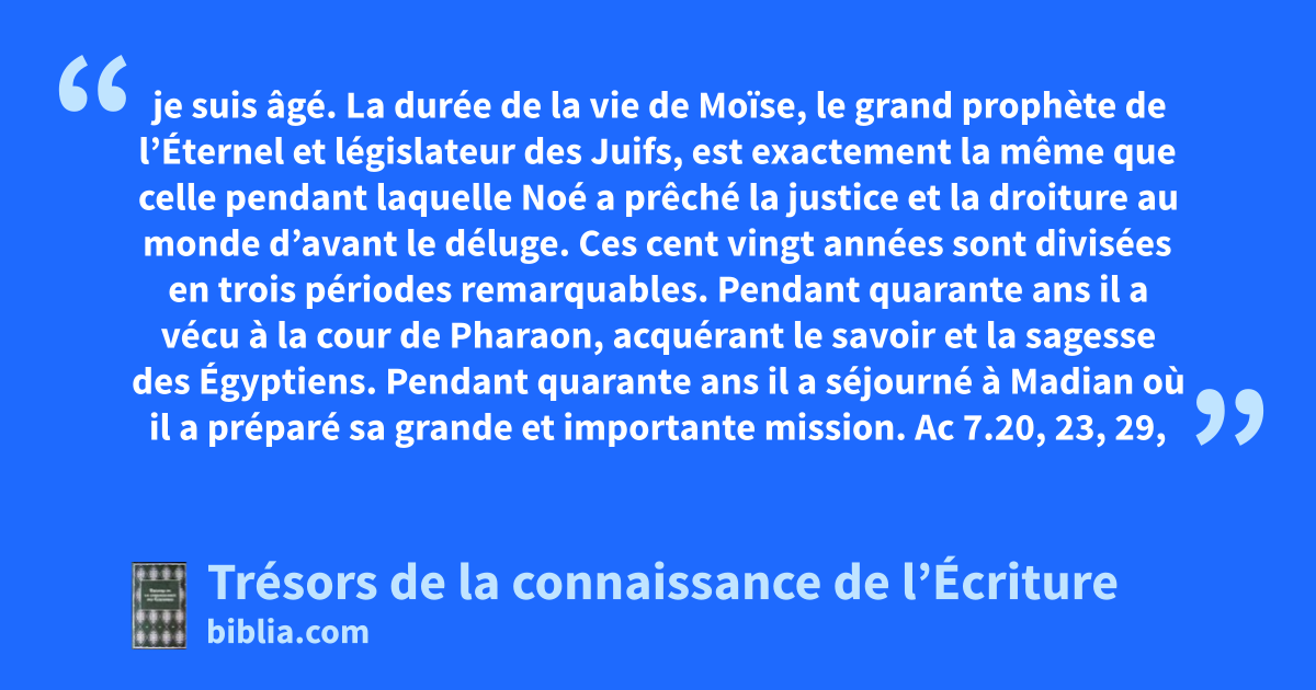 je suis âgé. La durée de la vie de Moïse, le grand prophète de l’Éternel et législateur des Juifs, est exactement la même que celle pendant laquelle Noé a prêché la justice et la droiture au monde d’avant le déluge. Ces cent vingt années sont divisées en trois périodes remarquables. Pendant quarante ans il a vécu à la cour de Pharaon, acquérant le savoir et la sagesse des Égyptiens. Pendant quarante ans il a séjourné à Madian où il a préparé sa grande et importante mission. Ac 7.20, 23, 29, 30. Et pendant quarante ans il a guidé, conduit, et gouverné les Israélites, sous la direction et l’autorité de Dieu. 34.7; Ex 7.7; Jos 14.10, 11; Ps 90.10; Ac 7.23 je ne pourrai plus. Voir : 34.7; Nb 27.17; 2S 21.17; 1R 3.7 tu ne passeras pas. 3.26, 27; 4.21, 22; 32.48-52; Nb 20.12; 27.13, 14; Ac 20.25 2P 1.13, 14