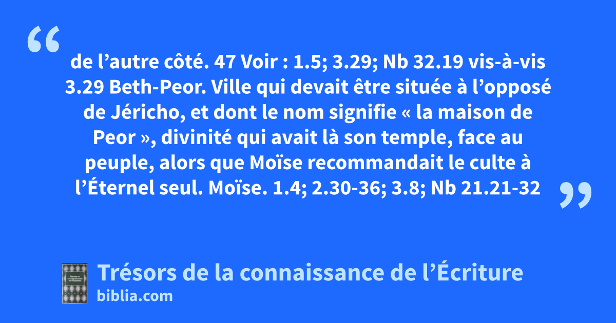 de l’autre côté. 47 Voir : 1.5; 3.29; Nb 32.19 vis-à-vis 3.29 Beth-Peor. Ville qui devait être située à l’opposé de Jéricho, et dont le nom signifie « la maison de Peor », divinité qui avait là son temple, face au peuple, alors que Moïse recommandait le culte à l’Éternel seul. Moïse. 1.4; 2.30-36; 3.8; Nb 21.21-32