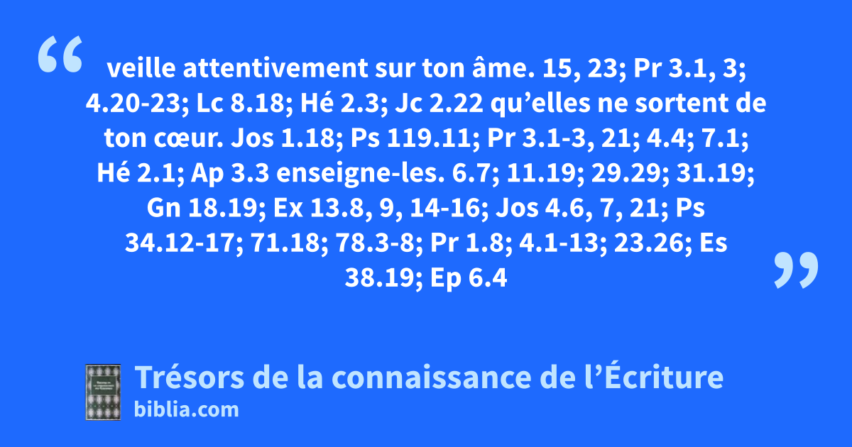 veille attentivement sur ton âme. 15, 23; Pr 3.1, 3; 4.20-23; Lc 8.18; Hé 2.3; Jc 2.22 qu’elles ne sortent de ton cœur. Jos 1.18; Ps 119.11; Pr 3.1-3, 21; 4.4; 7.1; Hé 2.1; Ap 3.3 enseigne-les. 6.7; 11.19; 29.29; 31.19; Gn 18.19; Ex 13.8, 9, 14-16; Jos 4.6, 7, 21; Ps 34.12-17; 71.18; 78.3-8; Pr 1.8; 4.1-13; 23.26; Es 38.19; Ep 6.4