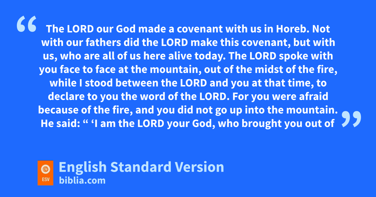 5 And Moses summoned all Israel and said to them, “Hear, O Israel, the statutes and the rules that I speak in your hearing today, and you shall learn them and be careful to do them. 2 xThe Lord our God made a covenant with us in Horeb. 3 yNot with our fathers did the Lord make this covenant, but with us, who are all of us here alive today. 4 The Lord spoke with you zface to face at the mountain, out of the midst of the fire, 5 awhile I stood between the Lord and you at that time, to declare to you the word of the Lord. For byou were afraid because of the fire, and you did not go up into the mountain. He said: