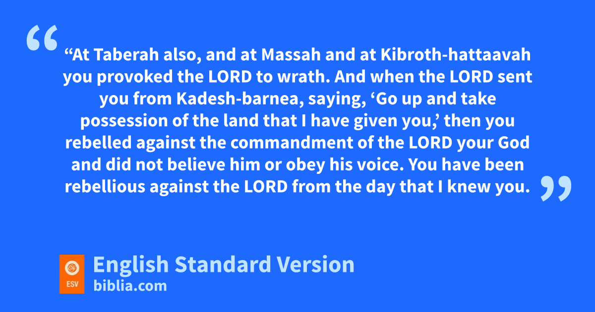 22 “At cTaberah also, and at dMassah and at eKibroth-hattaavah you provoked the Lord to wrath. 23 And fwhen the Lord sent you from Kadesh-barnea, saying, ‘Go up and take possession of the land that I have given you,’ then you rebelled against the commandment of the Lord your God and gdid not believe him or obey his voice. 24 hYou have been rebellious against the Lord from the day that I knew you.