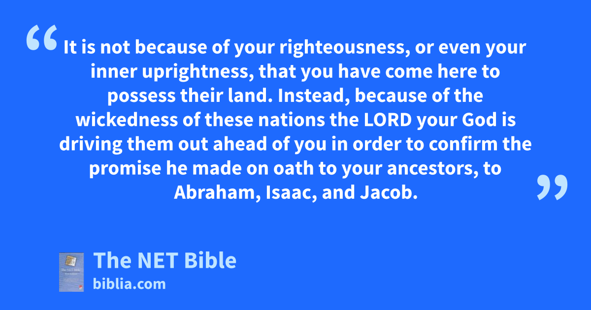 9:1 Listen, Israel: Today you are about to cross the Jordan so you can dispossess the nations there, people greater and stronger than you who live in large cities with extremely high fortifications.1 9:2 They include the Anakites,2 a numerous3 and tall people whom you know about and of whom it is said, “Who is able to resist the Anakites?” 9:3 Understand today that the Lord your God who goes before you is a devouring fire; he will defeat and subdue them before you. You will dispossess and destroy them quickly just as he4 has told you. 9:4 Do not think to yourself after the Lord your God has driven them out before you, “Because of my own righteousness the Lord has brought me here to possess this land.” It is because of the wickedness of these nations that the Lord is driving them out ahead of you. 9:5 It is not because of your righteousness, or even your inner uprightness,5 that you have come here to possess their land. Instead, because of the wickedness of these nations the Lord your God is driving them out ahead of you in order to confirm the promise he6 made on oath to your ancestors,7 to Abraham, Isaac, and Jacob. 9:6 Understand, therefore, that it is not because of your righteousness that the Lord your God is about to give you this good land as a possession, for you are a stubborn8 people!