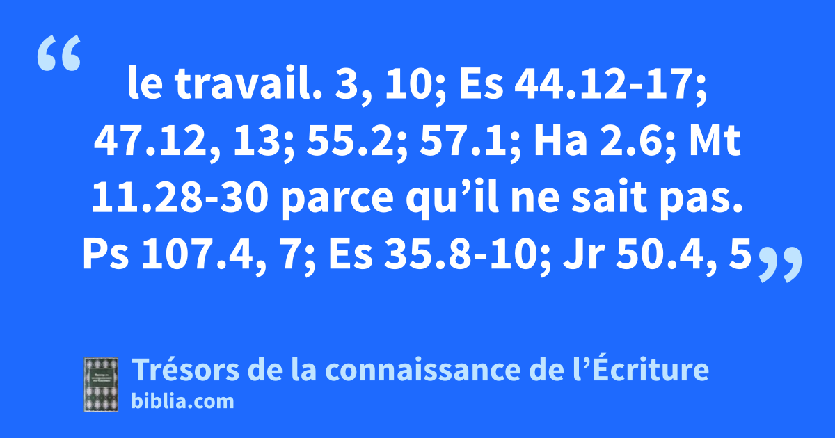 le travail. 3, 10; Es 44.12-17; 47.12, 13; 55.2; 57.1; Ha 2.6; Mt 11.28-30 parce qu’il ne sait pas. Ps 107.4, 7; Es 35.8-10; Jr 50.4, 5