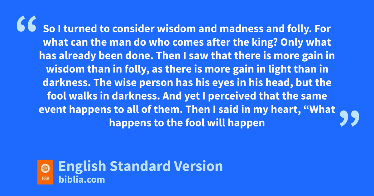 12 qSo I turned to consider rwisdom and madness and folly. For what can the man do who comes after the king? Only swhat has already been done. 13 Then I saw that there is more gain in wisdom than in folly, as there is more gain in light than in darkness. 14 tThe wise person has his eyes in his head, but the fool walks in darkness. And yet I perceived that the usame event happens to all of them. 15 Then I said in my heart, v“What happens to the fool will happen to me also. Why then have I been so very wise?” And I said in my heart that this also is vanity. 16 For of the wise as of the fool there is wno enduring remembrance, seeing that in the days to come all will have been long forgotten. xHow the wise dies just like the fool! 17 So I hated life, because what is done under the sun was grievous to me, for oall is vanity and a striving after wind.