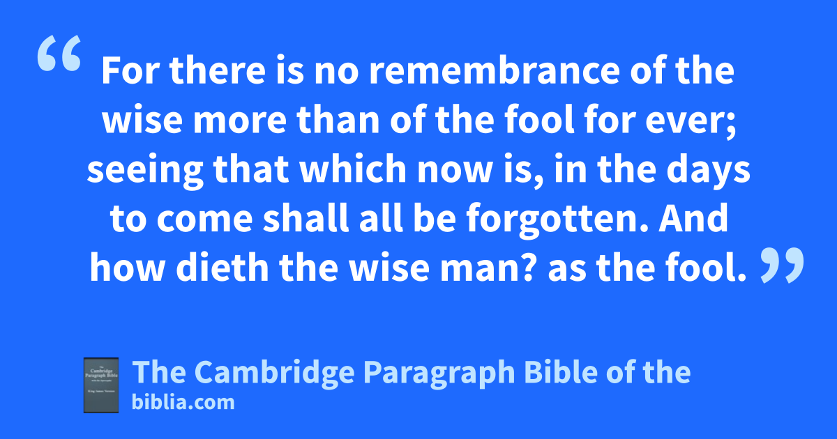 12 And I turned myself to behold wisdom, and bmadness, and cfolly: for what can the man do that cometh ccafter the king? * deven that which hath been ealready done. 13 Then I saw * that wisdom excelleth cfolly, as far as light aexcelleth darkness. 14 fThe wise man’s eyes are in his head; but the fool walketh in darkness: and I myself perceived also gthat hone event happeneth to them all. 15 Then said I in my heart, As hit happeneth to the fool, so it * happeneth even to me; and why was I then imore wise? Then I said in my heart, that this also is vanity. 16 For there is jno remembrance of the wise more than of the fool for ever; seeing that which enow is, in the days to come shall all be forgotten. And ghow dieth the wise man? as the fool. 17 Therefore I hated life; because the work that is wrought under the sun is grievous unto me: for all is kvanity and vexation of spirit. 18 Yea, I hated all my labour which I had * taken under the sun: because lI should leave it unto the man that shall be mafter me. 19 And lwho knoweth whether he shall be a wise man or a fool? yet shall he have rule over all my labour wherein I have laboured, and wherein I have shewed myself wise under the sun. This is also vanity. 20 Therefore I mmwent about to cause my heart to despair of all the labour which I took under the sun. 21 For there is a man whose labour is in wisdom, and in knowledge, and in nequity; yet to a man that hath not laboured therein shall he * leave it for his portion. This also is vanity and a great evil. 22 For what hath man oof all his labour, and of the pvexation of his heart, wherein he hath laboured under the sun? 23 For all qhis days are rsorrows, and his stravail rgrief; yea, his heart taketh not rest in the night. This is also vanity.