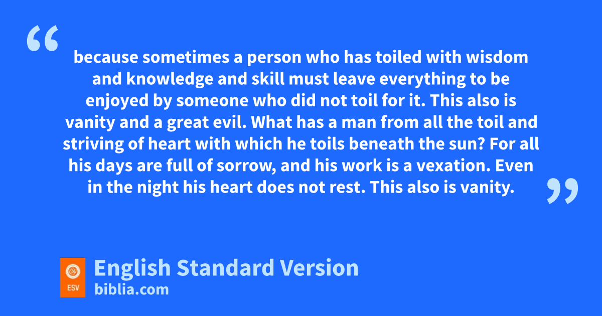 18 I hated yall my toil in which I toil under the sun, seeing that I must zleave it to the man who will come after me, 19 and who knows whether he will be wise or a fool? Yet he will be master of all for which I toiled and used my wisdom under the sun. This also is vanity. 20 So I aturned about and gave my heart up to despair bover all the toil of my labors under the sun, 21 because sometimes a person who has toiled with wisdom and knowledge and skill must leave everything to be enjoyed by someone who did not toil for it. This also is vanity and a great evil. 22 What has a man from call the toil and striving of heart with which he toils beneath the sun? 23 For dall his days are full of sorrow, and his ework is a vexation. Even in the night his heart does not rest. This also is vanity.