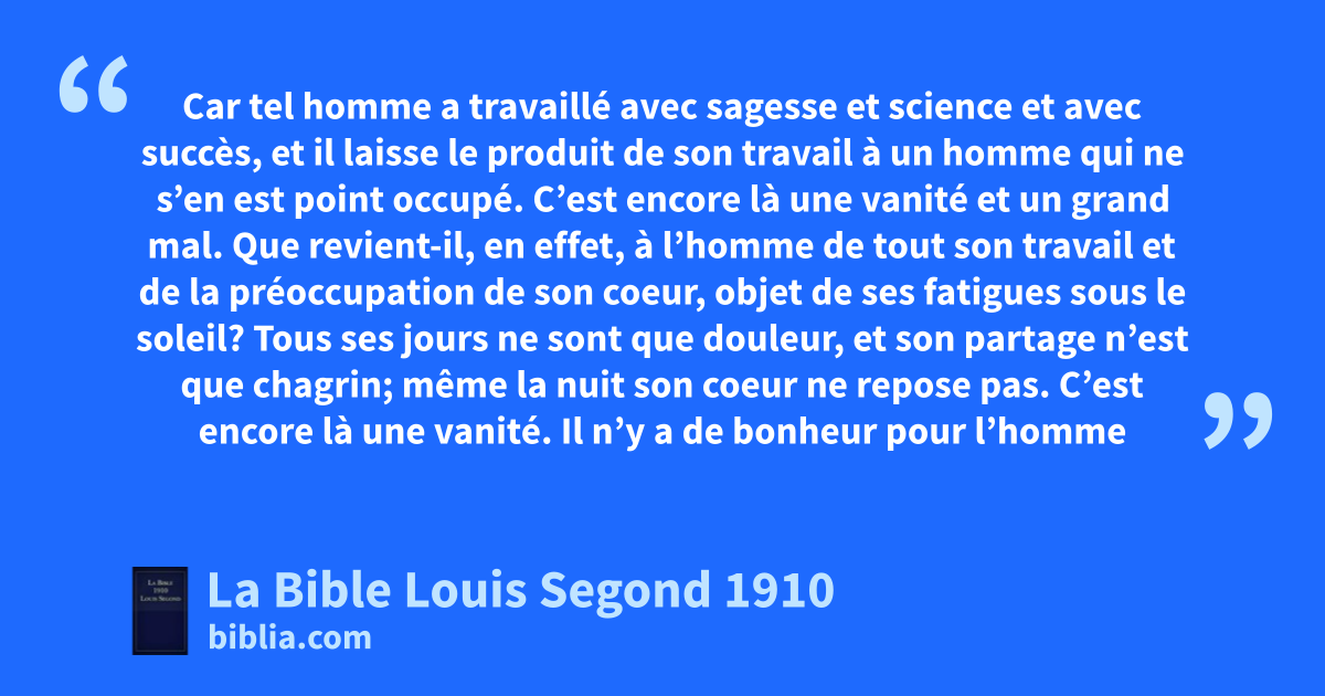 12bAlors j’ai tourné mes regards vers la sagesse, et vers la sottise et la folie. — Car que fera l’homme qui succédera au roi? Ce qu’on a déjà fait. 13Et j’ai vu que la sagesse a de l’avantage sur la folie, comme la lumière a de l’avantage sur les ténèbres; 14le sage a ses yeux à la tête, et l’insensé marche dans les ténèbres. Mais j’ai reconnu aussi qu’ils ont l’un et l’autre un même sort. 15Et j’ai dit en mon coeur: J’aurai le même sort que l’insensé; pourquoi donc ai-je été plus sage? Et j’ai dit en mon coeur que c’est encore là une vanité. 16Car la mémoire du sage n’est pas plus éternelle que celle de l’insensé, puisque déjà les jours qui suivent, tout est oublié. Eh quoi! le sage meurt aussi bien que l’insensé! 17Et j’ai haï la vie, car ce qui se fait sous le soleil m’a déplu, car tout est vanité et poursuite du vent. 18J’ai haï tout le travail que j’ai fait sous le soleil, et dont je dois laisser la jouissance à l’homme qui me succédera. 19Et qui sait s’il sera sage ou insensé? Cependant il sera maître de tout mon travail, de tout le fruit de ma sagesse sous le soleil. C’est encore là une vanité. 20Et j’en suis venu à livrer mon coeur au désespoir, à cause de tout le travail que j’ai fait sous le soleil. 21Car tel homme a travaillé avec sagesse et science et avec succès, et il laisse le produit de son travail à un homme qui ne s’en est point occupé. C’est encore là une vanité et un grand mal. 22cQue revient-il, en effet, à l’homme de tout son travail et de la préoccupation de son coeur, objet de ses fatigues sous le soleil? 23Tous ses jours ne sont que douleur, et son partage n’est que chagrin; même la nuit son coeur ne repose pas. C’est encore là une vanité. 24dIl n’y a de bonheur pour l’homme qu’à manger et à boire, et à faire jouir son âme du bien-être, au milieu de son travail; mais j’ai vu que cela aussi vient de la main de Dieu. 25Qui, en effet, peut manger et jouir, si ce n’est moi? 26Car il donne à l’homme qui lui est agréable la sagesse, la science et la joie; mais il donne au pécheur le soin de recueillir et d’amasser, eafin de donner à celui qui est agréable à Dieu. C’est encore là une vanité et la poursuite du vent.