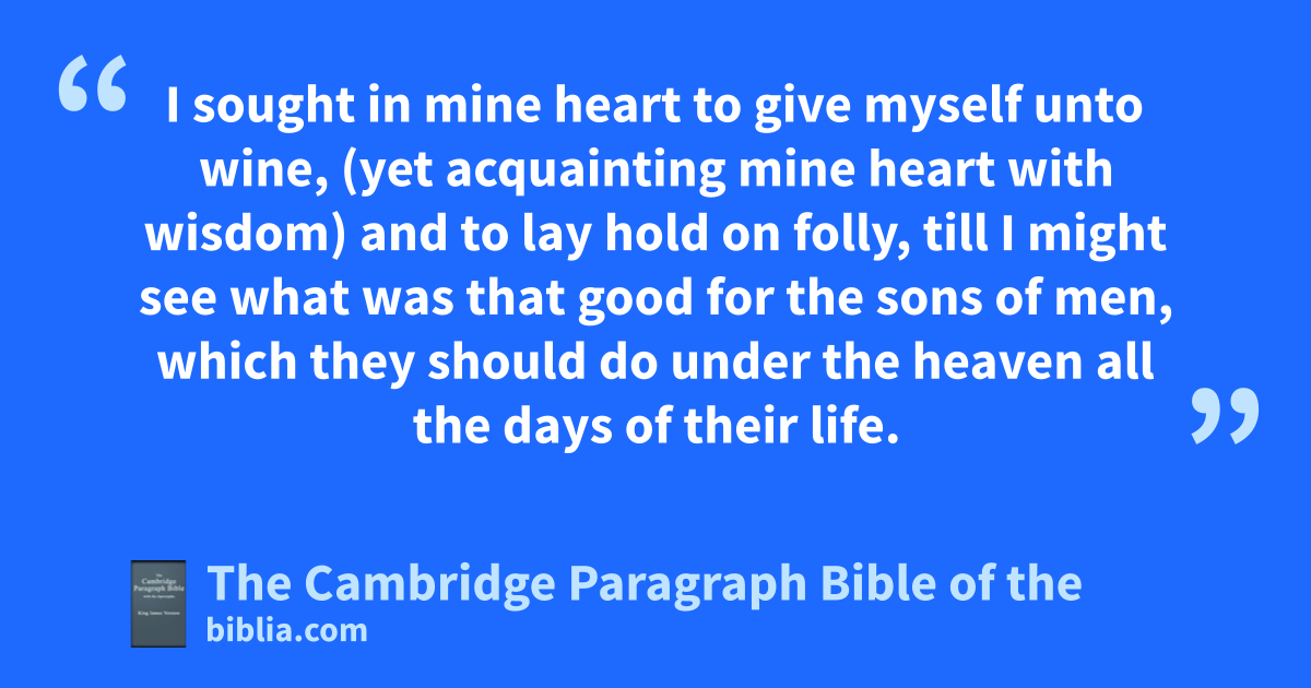 II. I said in mine heart, Go to now, I will prove thee with mirth, therefore aenjoy pleasure: and behold, this also is vanity. 2 bI said of laughter, It is cmad: and of mirth, What doeth it? 3 dI sought in mine heart * to give myself unto wine, (ddyet acquainting mine heart with wisdom) and to lay hold on efolly, till I might see what was that good for the sons of men, which they should do under the heaven * all the days of their life. 4 I made me great works; fI builded me houses; gI planted me vineyards: 5 I made me hgardens and iorchards, and I planted trees in them of all kind of fruits: 6 I made me pools of water, to water therewith the wood that bringeth forth trees: 7 I kgot me servants and maidens, and had * servants born in my house; also I had great possessions of lgreat and small cattle above all that were min Jerusalem before me: 8 nI gathered me also silver and gold, and the opeculiar treasure of pkings and of the qprovinces: I gat me rmen singers and women singers, and the sdelights of the sons of men, as * musical instruments, and that of all sorts. 9 So tI was great, and increased more than all that were before me min Jerusalem: also umy wisdom remained with me. 10 And whatsoever mine eyes desired I xkept not from them, I withheld not my heart from any joy; for my heart rejoiced in all my labour: and ythis was my portion of all my labour. 11 Then I looked on all the works that my hands had wrought, and on the labour that I had laboured to do: and behold, all was zvanity and vexation of spirit, and there was no aprofit under the sun.