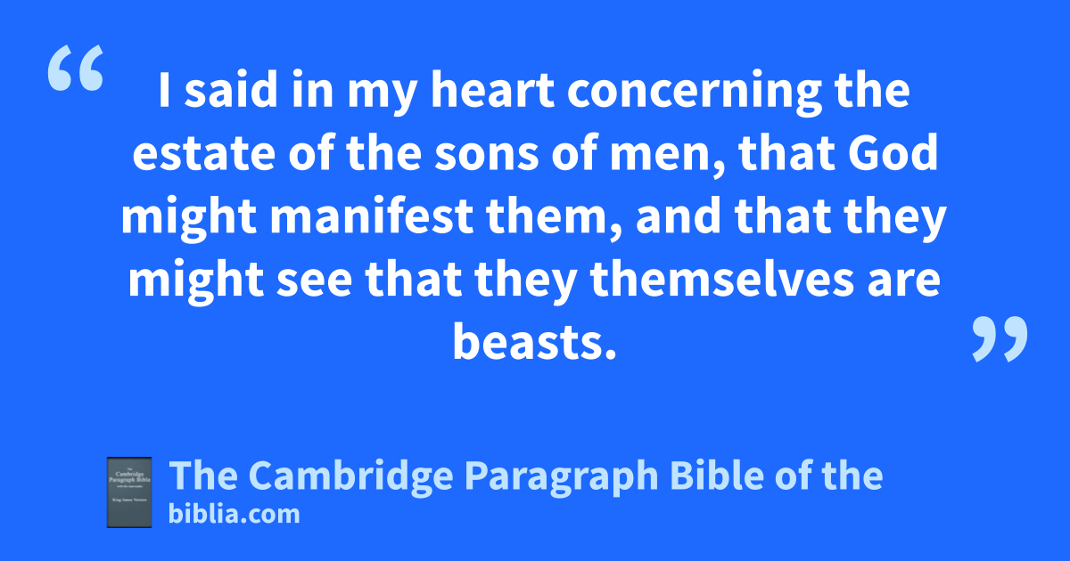 18 I said in my heart econcerning the estate of the sons of men, * that God might fmanifest them, and that they might see gthat they themselves are beasts. 19 For hthat which befalleth the sons of men befalleth beasts; even ione thing befalleth them: as the one dieth, so dieth the other; yea, they have all one breath; so that a man hath no preeminence above a beast: for all is vanity. 20 All go unto one place; kall are of the dust, and all turn to dust again. 21 Who knoweth lthe spirit * of man that * goeth upward, and the spirit of the beast that goeth downward to the earth? 22 Wherefore I perceive mthat there is nothing better, than that a man should rejoice in his own works; for nthat is his portion: for who shall bring him to see owhat shall be after him?