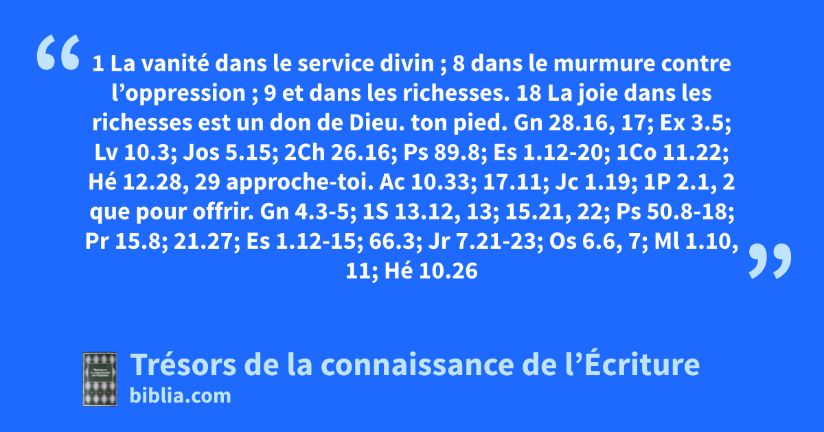 1 La vanité dans le service divin ; 8 dans le murmure contre l’oppression ; 9 et dans les richesses. 18 La joie dans les richesses est un don de Dieu.