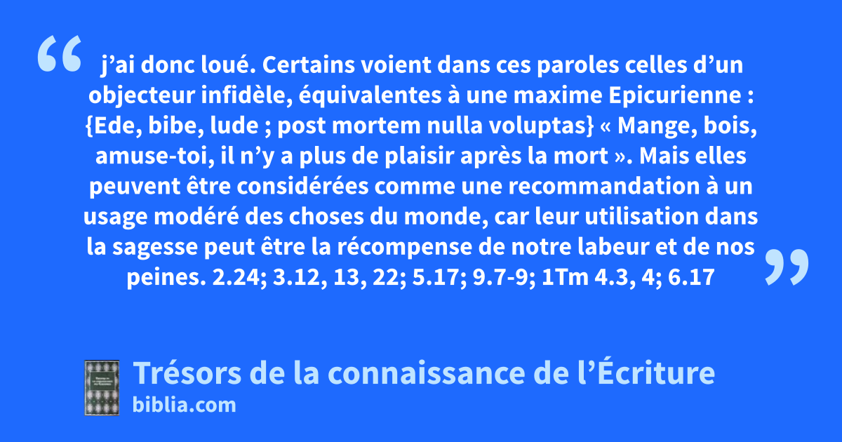 j’ai donc loué. Certains voient dans ces paroles celles d’un objecteur infidèle, équivalentes à une maxime Epicurienne : {Ede, bibe, lude ; post mortem nulla voluptas} « Mange, bois, amuse-toi, il n’y a plus de plaisir après la mort ». Mais elles peuvent être considérées comme une recommandation à un usage modéré des choses du monde, car leur utilisation dans la sagesse peut être la récompense de notre labeur et de nos peines. 2.24; 3.12, 13, 22; 5.17; 9.7-9; 1Tm 4.3, 4; 6.17