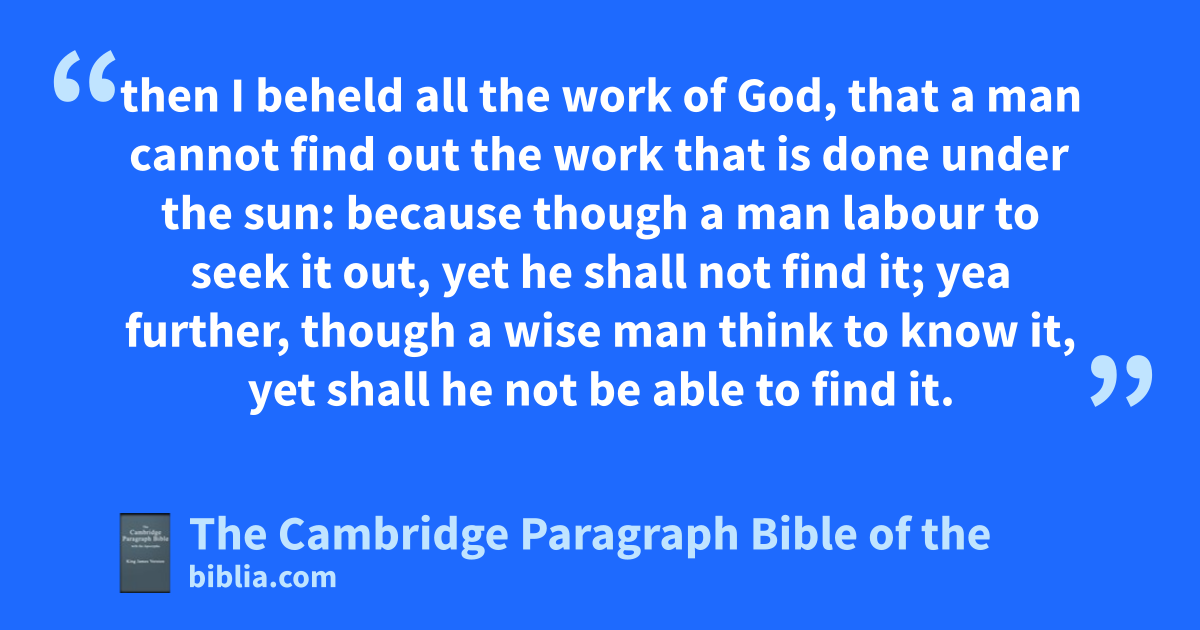 16 When I applied mine heart to know wisdom, and to see the ibusiness that is done upon the earth: (for also there is that neither day nor night seeth sleep with his eyes:) 17 then I beheld all the work of God, that ka man cannot find out the work that is done under the sun: because though a man labour to seek it out, yet he shall not find it; yea further, though a wise man think to know it, lyet shall he not be able to find it.