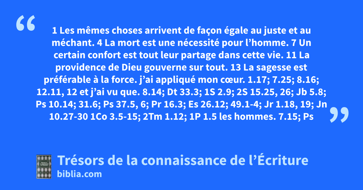1 Les mêmes choses arrivent de façon égale au juste et au méchant. 4 La mort est une nécessité pour l’homme. 7 Un certain confort est tout leur partage dans cette vie. 11 La providence de Dieu gouverne sur tout. 13 La sagesse est préférable à la force.