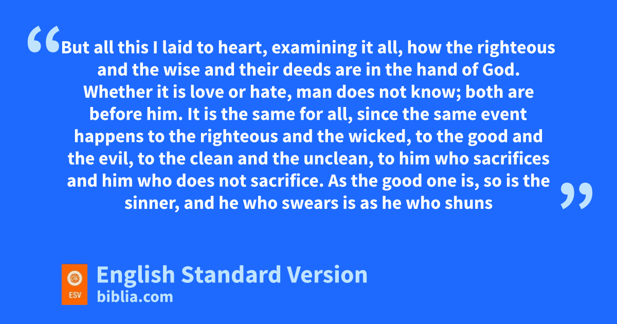 9 But all this I laid to heart, examining it all, chow the righteous and the wise and their deeds are din the hand of God. Whether it is love or hate, man does not know; both are before him. 2 eIt is the same for all, since fthe same event happens to the righteous and the wicked, to the good and the evil,1 to the clean and the unclean, to him who sacrifices and him who does not sacrifice. As the good one is, so is the sinner, and he who gswears is as he who shuns an oath. 3 This is an evil in all that is done under the sun, that ethe same event happens to all. Also, the hearts of the children of man are full of evil, and hmadness is in their hearts while they live, and after that they go to the dead. 4 But he who is joined with all the living has hope, for a living dog is better than a dead lion. 5 For the living know that they will die, but ithe dead know nothing, and they have no more reward, for jthe memory of them is forgotten. 6 Their love and their hate and their envy have already perished, and forever they have no more share in all that is done under the sun.