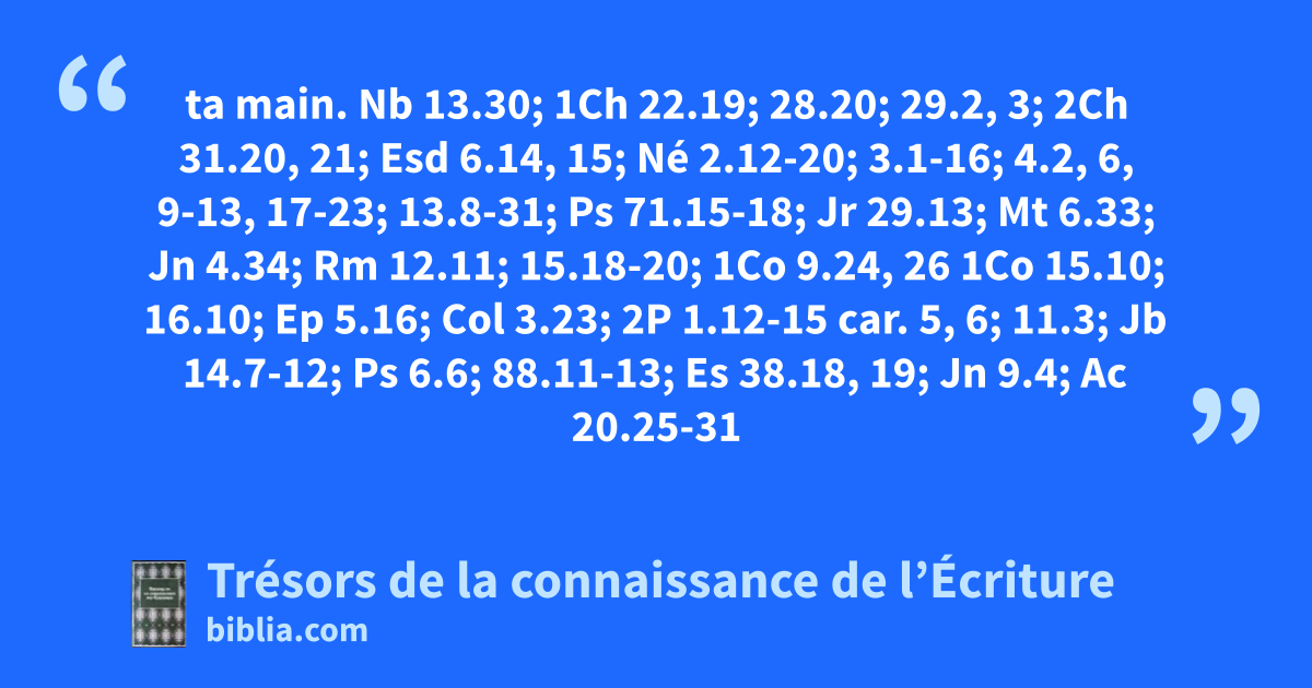 ta main. Nb 13.30; 1Ch 22.19; 28.20; 29.2, 3; 2Ch 31.20, 21; Esd 6.14, 15; Né 2.12-20; 3.1-16; 4.2, 6, 9-13, 17-23; 13.8-31; Ps 71.15-18; Jr 29.13; Mt 6.33; Jn 4.34; Rm 12.11; 15.18-20; 1Co 9.24, 26 1Co 15.10; 16.10; Ep 5.16; Col 3.23; 2P 1.12-15 car. 5, 6; 11.3; Jb 14.7-12; Ps 6.6; 88.11-13; Es 38.18, 19; Jn 9.4; Ac 20.25-31