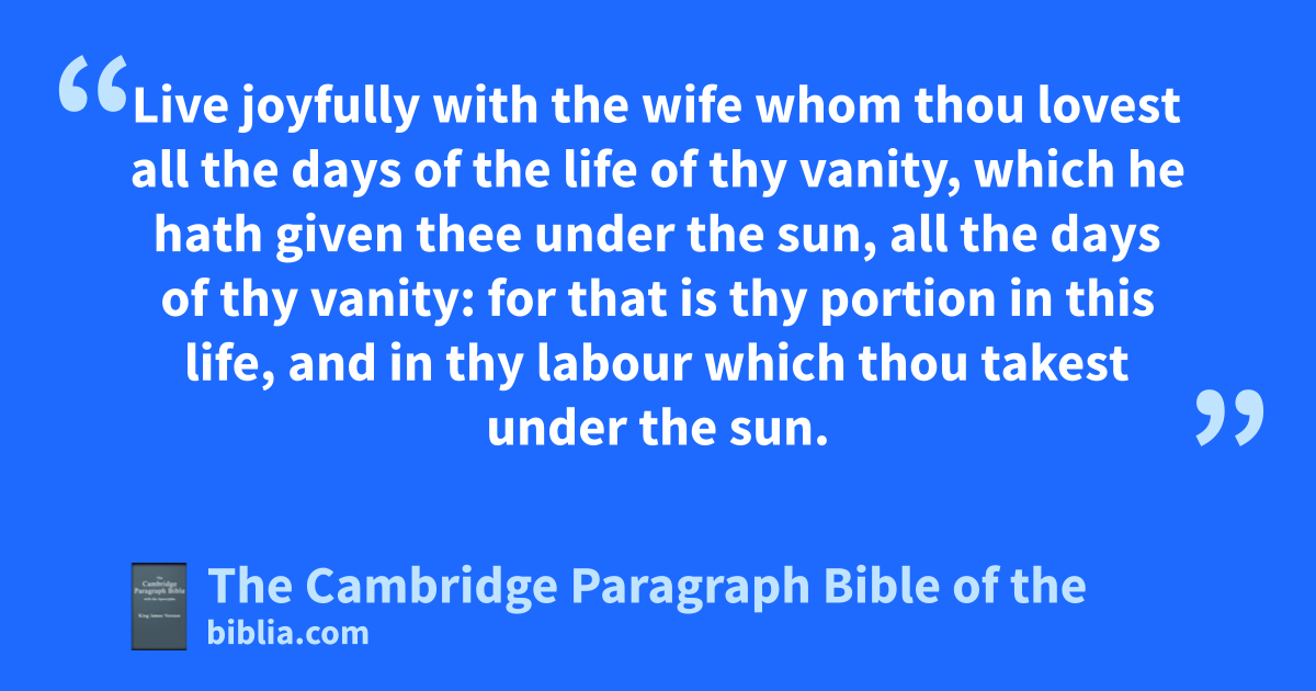 7 Go thy way, leat thy bread with joy, and drink thy wine with a merry heart; mfor God know accepteth thy works. 8 Let nthy garments be always white; and olet thy head lack no ointment. 9 * Live joyfully with the wife whom thou lovest all the days of the life of thy vanity, pwhich he hath given thee under the sun, all the days of thy vanity: qfor that is thy portion in this life, and in thy labour which thou takest under the sun. 10 Whatsoever rthy hand findeth to do, sdo it with thy might; for there is no work, nor tdevice, nor knowledge, nor wisdom, in the grave, whither thou goest.