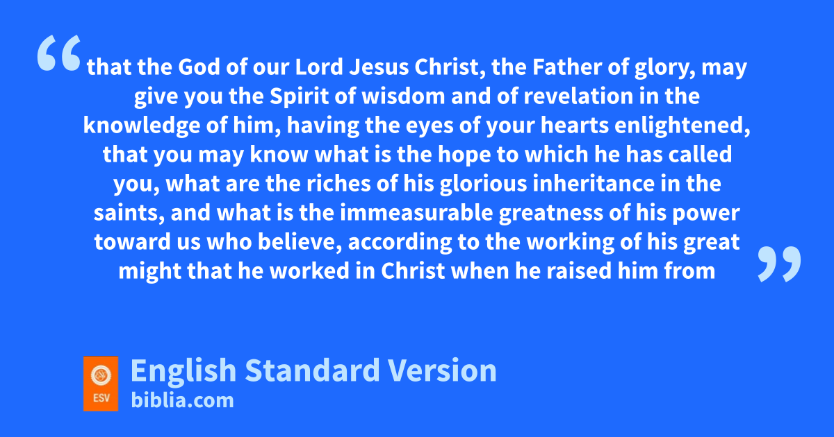 15 For this reason, mbecause I have heard of your faith in the Lord Jesus and your love6 toward all the saints, 16 I ndo not cease to give thanks for you, oremembering you in my prayers, 17 that pthe God of our Lord Jesus Christ, the Father of glory, qmay give you the Spirit of wisdom and of revelation in the knowledge of him, 18 rhaving the eyes of your hearts enlightened, that you may know what is sthe hope to which he has called you, what are tthe riches of his glorious inheritance in the saints, 19 and what is the immeasurable greatness of his power toward us who believe, uaccording to the working of vhis great might 20 that he worked in Christ wwhen he raised him from the dead and xseated him at his right hand yin the heavenly places, 21 zfar above aall rule and authority and power and dominion, and above bevery name that is named, not only in cthis age but also in the one to come. 22 And dhe put all things under his feet and gave him as ehead over all things to the church, 23 fwhich is his body, gthe fullness of him hwho fills iall in all.