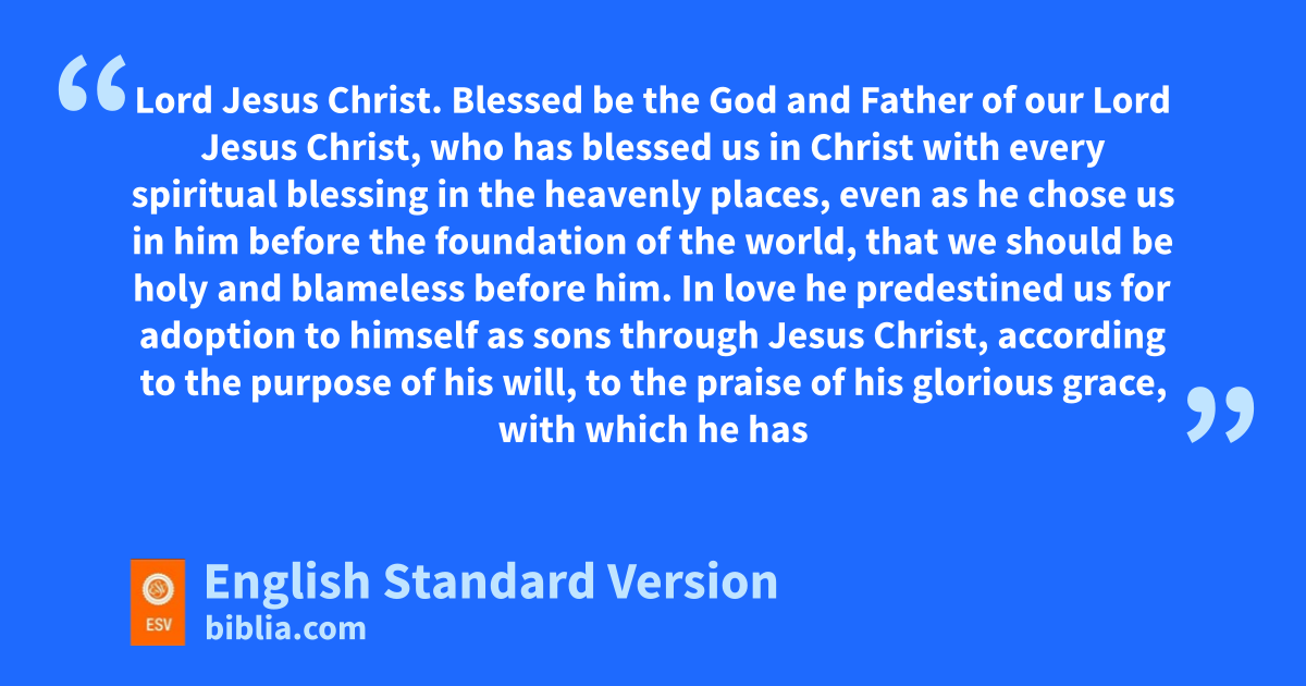3 eBlessed be fthe God and Father of our Lord Jesus Christ, who has blessed us in Christ with every spiritual blessing gin the heavenly places, 4 heven as he ichose us in him jbefore the foundation of the world, that we should be kholy and blameless before him. In love 5 lhe predestined us2 for madoption to himself as sons through Jesus Christ, naccording to the purpose of his will, 6 oto the praise of his glorious grace, with which he has blessed us in pthe Beloved. 7 qIn him we have rredemption sthrough his blood, tthe forgiveness of our trespasses, uaccording to the riches of his grace, 8 which he lavished upon us, in all wisdom and insight 9 vmaking known3 to us the mystery of his will, naccording to his purpose, which he wset forth in Christ2 10 as a plan for xthe fullness of time, yto unite all things in Christ, things in heaven and things on earth in him.
