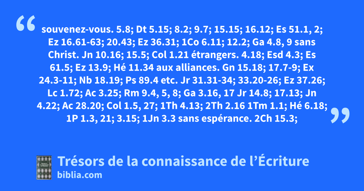 souvenez-vous. 5.8; Dt 5.15; 8.2; 9.7; 15.15; 16.12; Es 51.1, 2; Ez 16.61-63; 20.43; Ez 36.31; 1Co 6.11; 12.2; Ga 4.8, 9 sans Christ. Jn 10.16; 15.5; Col 1.21 étrangers. 4.18; Esd 4.3; Es 61.5; Ez 13.9; Hé 11.34 aux alliances. Gn 15.18; 17.7-9; Ex 24.3-11; Nb 18.19; Ps 89.4 etc. Jr 31.31-34; 33.20-26; Ez 37.26; Lc 1.72; Ac 3.25; Rm 9.4, 5, 8; Ga 3.16, 17 Jr 14.8; 17.13; Jn 4.22; Ac 28.20; Col 1.5, 27; 1Th 4.13; 2Th 2.16 1Tm 1.1; Hé 6.18; 1P 1.3, 21; 3.15; 1Jn 3.3 sans espérance. 2Ch 15.3; Es 44.6; 45.20; Os 3.4; Ac 14.15, 16; Rm 1.28-32 1Co 8.4-6; 10.19, 20; Ga 4.8; 1Th 4.5