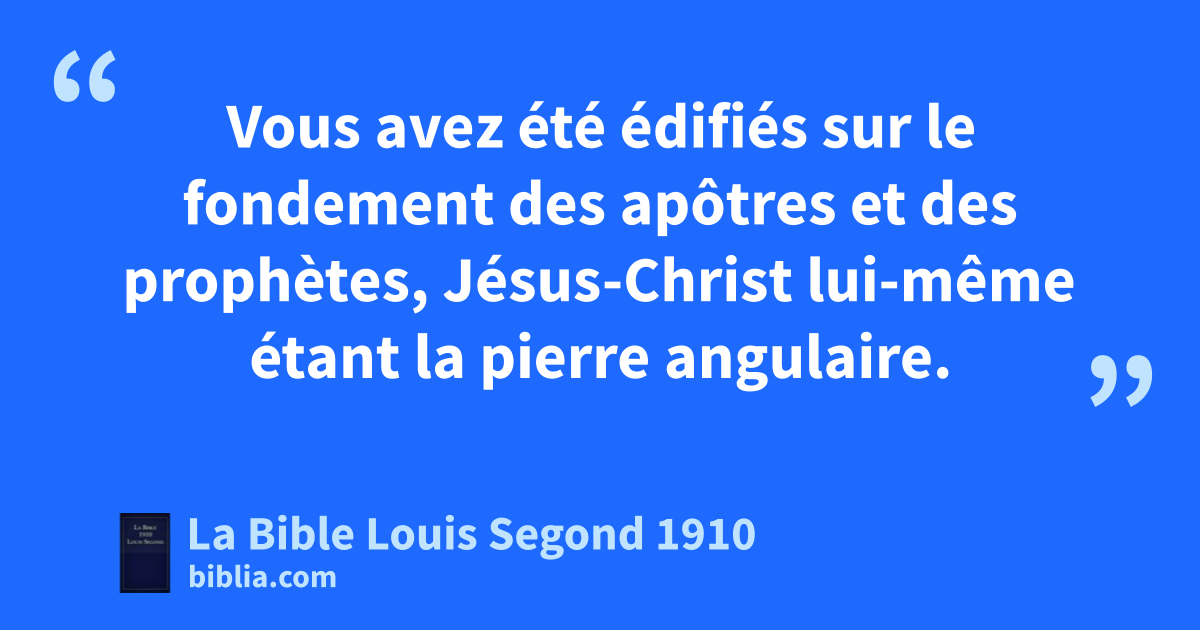 19Ainsi donc, vous n’êtes plus des étrangers, ni des gens du dehors; mais vous êtes concitoyens des saints, mgens de la maison de Dieu. 20Vous avez été nédifiés osur le fondement des apôtres et des prophètes, pJésus-Christ lui-même étant la pierre angulaire. 21qEn lui tout l’édifice, bien coordonné, s’élève pour être run temple saint dans le Seigneur. 22En lui vous êtes aussi édifiés pour être une habitation de Dieu en Esprit.