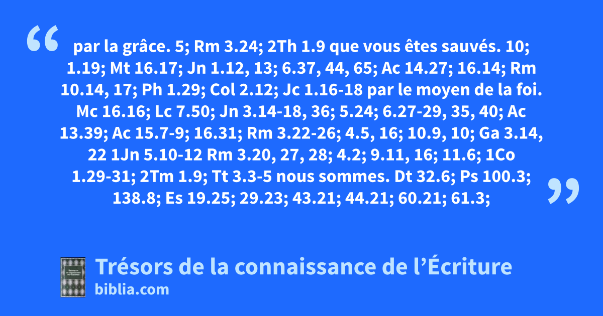 par la grâce. 5; Rm 3.24; 2Th 1.9 que vous êtes sauvés. 10; 1.19; Mt 16.17; Jn 1.12, 13; 6.37, 44, 65; Ac 14.27; 16.14; Rm 10.14, 17; Ph 1.29; Col 2.12; Jc 1.16-18 par le moyen de la foi. Mc 16.16; Lc 7.50; Jn 3.14-18, 36; 5.24; 6.27-29, 35, 40; Ac 13.39; Ac 15.7-9; 16.31; Rm 3.22-26; 4.5, 16; 10.9, 10; Ga 3.14, 22 1Jn 5.10-12