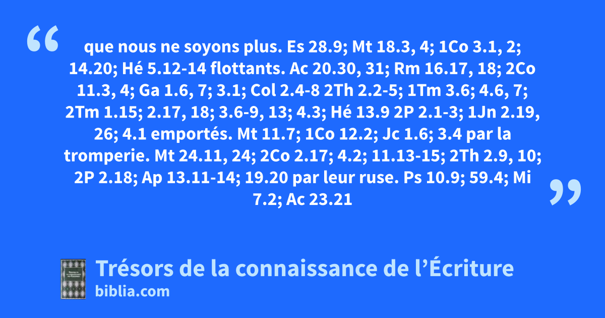 que nous ne soyons plus. Es 28.9; Mt 18.3, 4; 1Co 3.1, 2; 14.20; Hé 5.12-14 flottants. Ac 20.30, 31; Rm 16.17, 18; 2Co 11.3, 4; Ga 1.6, 7; 3.1; Col 2.4-8 2Th 2.2-5; 1Tm 3.6; 4.6, 7; 2Tm 1.15; 2.17, 18; 3.6-9, 13; 4.3; Hé 13.9 2P 2.1-3; 1Jn 2.19, 26; 4.1 emportés. Mt 11.7; 1Co 12.2; Jc 1.6; 3.4 par la tromperie. Mt 24.11, 24; 2Co 2.17; 4.2; 11.13-15; 2Th 2.9, 10; 2P 2.18; Ap 13.11-14; 19.20 par leur ruse. Ps 10.9; 59.4; Mi 7.2; Ac 23.21
