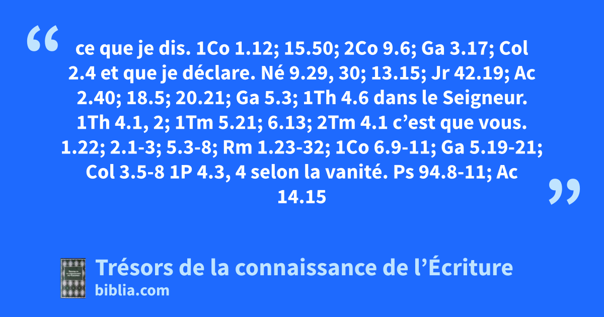 ce que je dis. 1Co 1.12; 15.50; 2Co 9.6; Ga 3.17; Col 2.4 et que je déclare. Né 9.29, 30; 13.15; Jr 42.19; Ac 2.40; 18.5; 20.21; Ga 5.3; 1Th 4.6 dans le Seigneur. 1Th 4.1, 2; 1Tm 5.21; 6.13; 2Tm 4.1 c’est que vous. 1.22; 2.1-3; 5.3-8; Rm 1.23-32; 1Co 6.9-11; Ga 5.19-21; Col 3.5-8 1P 4.3, 4 selon la vanité. Ps 94.8-11; Ac 14.15
