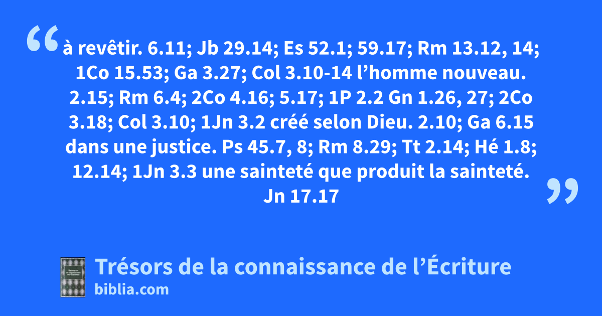 à revêtir. 6.11; Jb 29.14; Es 52.1; 59.17; Rm 13.12, 14; 1Co 15.53; Ga 3.27; Col 3.10-14 l’homme nouveau. 2.15; Rm 6.4; 2Co 4.16; 5.17; 1P 2.2 Gn 1.26, 27; 2Co 3.18; Col 3.10; 1Jn 3.2 créé selon Dieu. 2.10; Ga 6.15 dans une justice. Ps 45.7, 8; Rm 8.29; Tt 2.14; Hé 1.8; 12.14; 1Jn 3.3 une sainteté que produit la sainteté. Jn 17.17