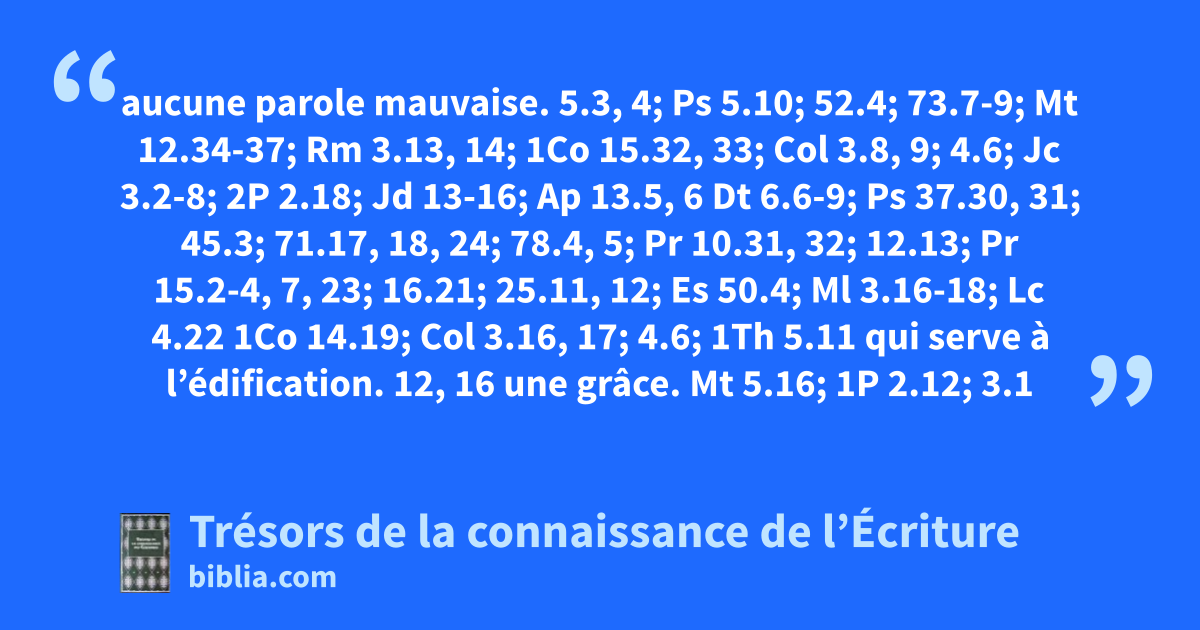 aucune parole mauvaise. 5.3, 4; Ps 5.10; 52.4; 73.7-9; Mt 12.34-37; Rm 3.13, 14; 1Co 15.32, 33; Col 3.8, 9; 4.6; Jc 3.2-8; 2P 2.18; Jd 13-16; Ap 13.5, 6 Dt 6.6-9; Ps 37.30, 31; 45.3; 71.17, 18, 24; 78.4, 5; Pr 10.31, 32; 12.13; Pr 15.2-4, 7, 23; 16.21; 25.11, 12; Es 50.4; Ml 3.16-18; Lc 4.22 1Co 14.19; Col 3.16, 17; 4.6; 1Th 5.11 qui serve à l’édification. 12, 16 une grâce. Mt 5.16; 1P 2.12; 3.1