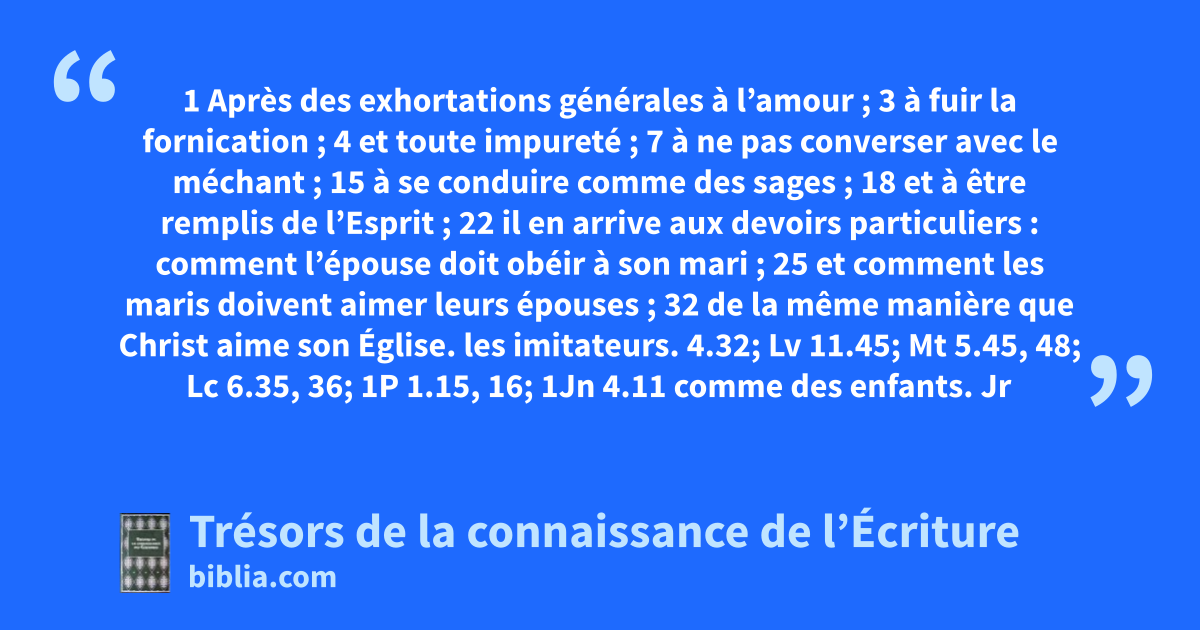 1 Après des exhortations générales à l’amour ; 3 à fuir la fornication ; 4 et toute impureté ; 7 à ne pas converser avec le méchant ; 15 à se conduire comme des sages ; 18 et à être remplis de l’Esprit ; 22 il en arrive aux devoirs particuliers : comment l’épouse doit obéir à son mari ; 25 et comment les maris doivent aimer leurs épouses ; 32 de la même manière que Christ aime son Église.