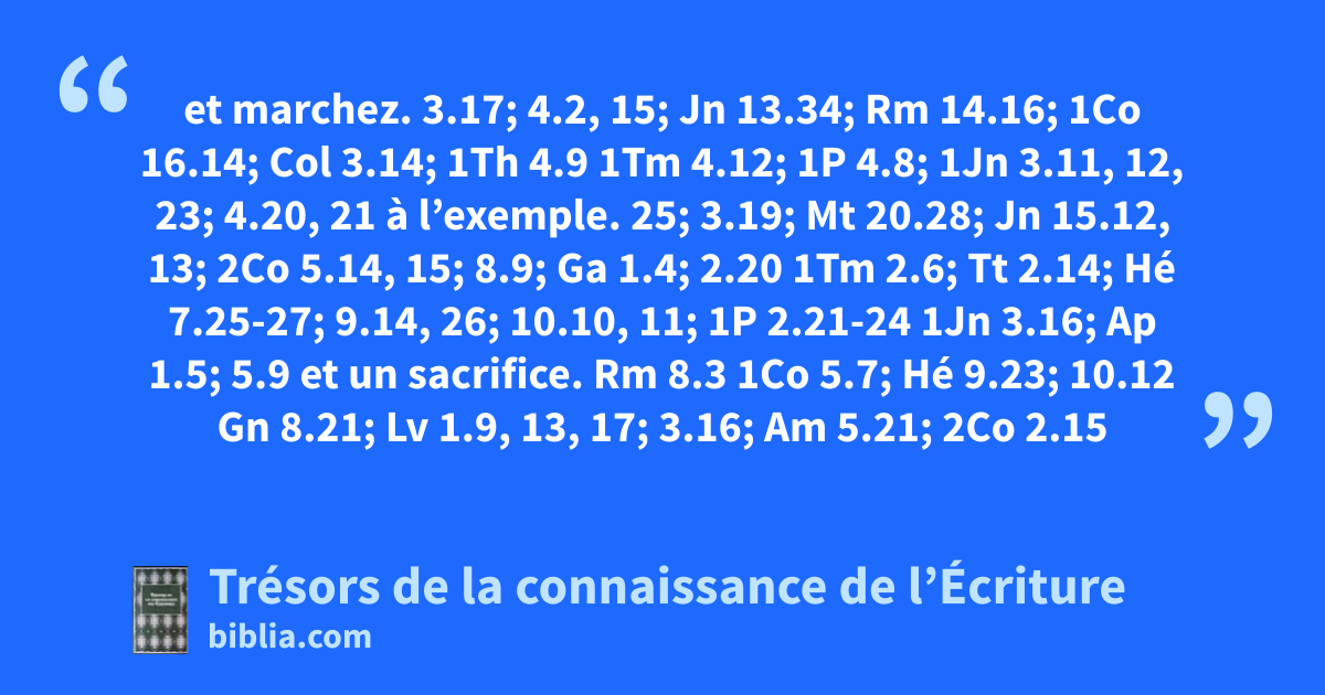et marchez. 3.17; 4.2, 15; Jn 13.34; Rm 14.16; 1Co 16.14; Col 3.14; 1Th 4.9 1Tm 4.12; 1P 4.8; 1Jn 3.11, 12, 23; 4.20, 21 à l’exemple. 25; 3.19; Mt 20.28; Jn 15.12, 13; 2Co 5.14, 15; 8.9; Ga 1.4; 2.20 1Tm 2.6; Tt 2.14; Hé 7.25-27; 9.14, 26; 10.10, 11; 1P 2.21-24 1Jn 3.16; Ap 1.5; 5.9 et un sacrifice. Rm 8.3 1Co 5.7; Hé 9.23; 10.12 Gn 8.21; Lv 1.9, 13, 17; 3.16; Am 5.21; 2Co 2.15