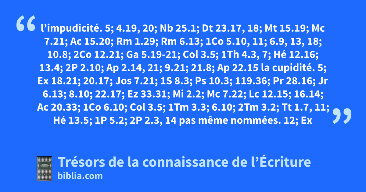 l’impudicité. 5; 4.19, 20; Nb 25.1; Dt 23.17, 18; Mt 15.19; Mc 7.21; Ac 15.20; Rm 1.29; Rm 6.13; 1Co 5.10, 11; 6.9, 13, 18; 10.8; 2Co 12.21; Ga 5.19-21; Col 3.5; 1Th 4.3, 7; Hé 12.16; 13.4; 2P 2.10; Ap 2.14, 21; 9.21; 21.8; Ap 22.15 la cupidité. 5; Ex 18.21; 20.17; Jos 7.21; 1S 8.3; Ps 10.3; 119.36; Pr 28.16; Jr 6.13; 8.10; 22.17; Ez 33.31; Mi 2.2; Mc 7.22; Lc 12.15; 16.14; Ac 20.33; 1Co 6.10; Col 3.5; 1Tm 3.3; 6.10; 2Tm 3.2; Tt 1.7, 11; Hé 13.5; 1P 5.2; 2P 2.3, 14 pas même nommées. 12; Ex 23.13; 1Co 5.1 ainsi qu’il convient. Rm 16.2; Ph 1.27; 1Tm 2.10; Tt 2.3
