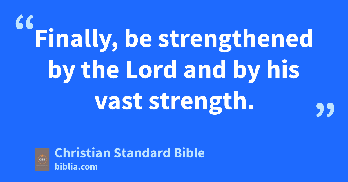 10 Finally, be strengthened by the Lord and by his vast strength.ak 11 Put onal the full armoram of God so that you can stand against the schemes of the devil. 12 For our struggle is not against fleshan and blood, but against the rulers, against the authorities,ao against the cosmic powers of this darkness, against evil,ap spiritual forces in the heavens.aq 13 For this reason take up the full armorar of God, so that you may be able to resistas in the evil day, and having prepared everything, to take your stand. 14 Stand,at therefore, with truthau like a belt around your waist, righteousnessav like armor on your chest,aw 15 and your feet sandaled with readiness for the gospel of peace. 16 In every situation take up the shieldax of faithay with which you can extinguish all the flaming arrows of the evil one.az 17 Take the helmetba of salvation and the swordbb of the Spiritbc—which is the word of God. 18 Praybd at all times in the Spiritbe with every prayer and request, and stay alertbf with all perseverance and intercession for all the saints. 19 Pray also for me, that the message may be given to me when I open my mouth to make known with boldnessbg the mystery of the gospel. 20 For this I am an ambassadora in chains. Pray that I might be bold enough to speak about it as I should.