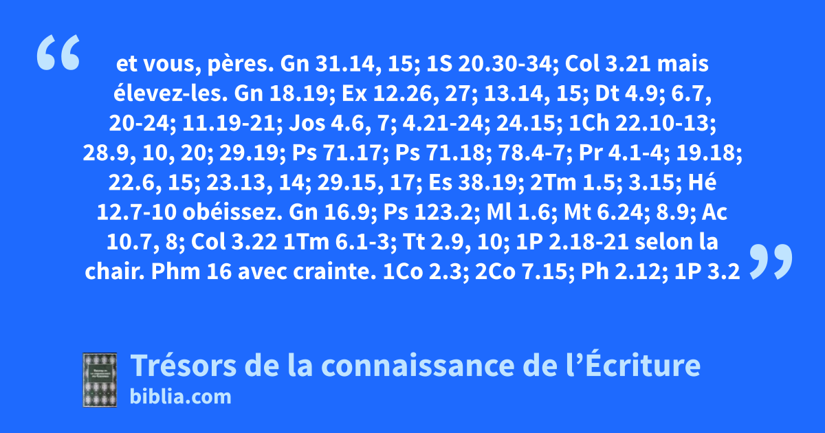 et vous, pères. Gn 31.14, 15; 1S 20.30-34; Col 3.21 mais élevez-les. Gn 18.19; Ex 12.26, 27; 13.14, 15; Dt 4.9; 6.7, 20-24; 11.19-21; Jos 4.6, 7; 4.21-24; 24.15; 1Ch 22.10-13; 28.9, 10, 20; 29.19; Ps 71.17; Ps 71.18; 78.4-7; Pr 4.1-4; 19.18; 22.6, 15; 23.13, 14; 29.15, 17; Es 38.19; 2Tm 1.5; 3.15; Hé 12.7-10