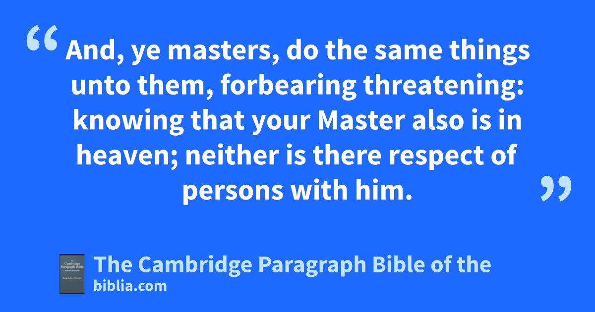 5 gServants, be obedient to them that are your masters ggaccording to the flesh, hwith fear and trembling, giin singleness of your heart, iias unto Christ; 6 gnot with eyeservice, as jmenpleasers; but as kthe servants of Christ, doing lthe will of God from the heart; 7 mwith good will doing service, as to the Lord, and not to men: 8 knowing that whatsoever good thing any man doeth, nthe same shall he receive of the Lord, owhether he be bond or free. 9 And, pye masters, do the same things unto them, * qforbearing threatening: knowing that * kryour Master also is in heaven; sneither is there respect of persons with him.