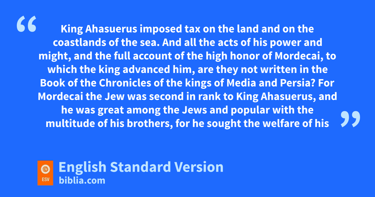 10 King Ahasuerus imposed tax on the land and on ythe coastlands of the sea. 2 And all the acts of his power and might, and the full account of the high honor of Mordecai, zto which the king advanced him, are they not written in athe Book of the Chronicles of the kings of Media and Persia? 3 For Mordecai the Jew was bsecond in rank to King Ahasuerus, and he was great among the Jews and popular with the multitude of his brothers, for he csought the welfare of his people and spoke peace to all his people.