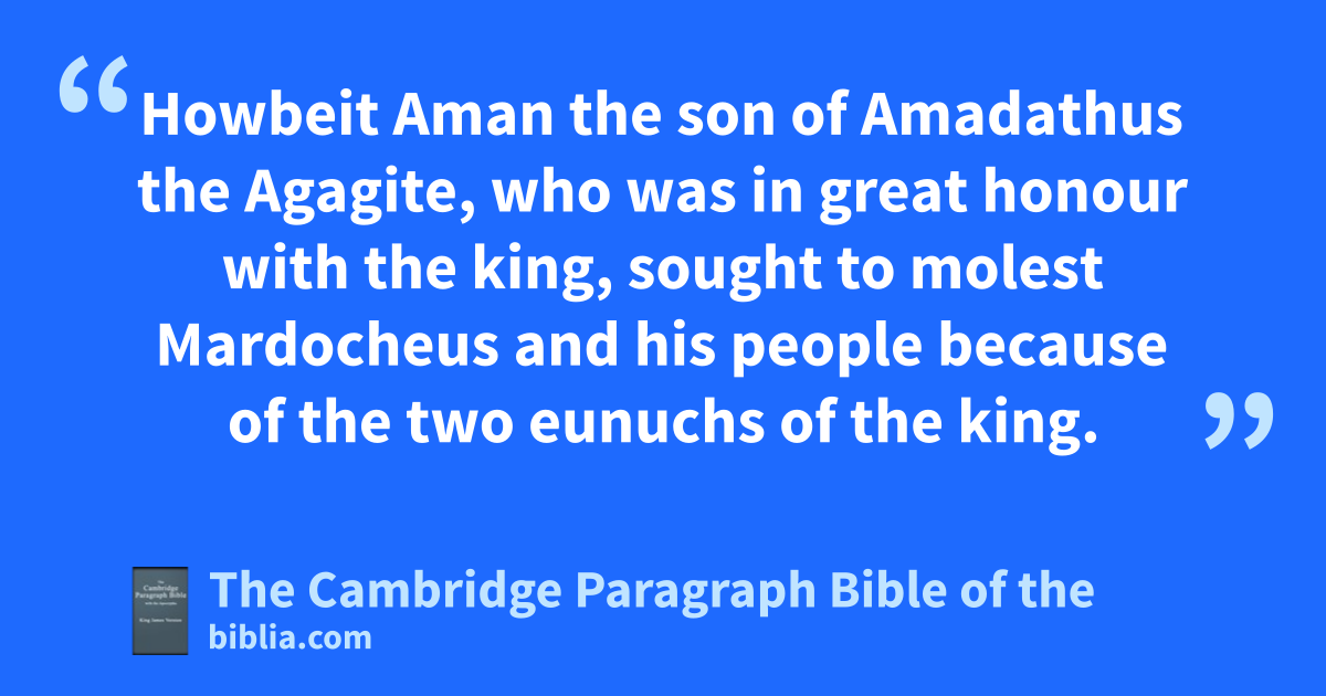 XII. And aMardocheus took his rest in the court with Gabatha and Tharra, the two eunuchs of the king, and keepers of the palace. 2 And bhe heard their devices, and searched out their purposes, and learned that they were about to lay hands upon Artaxerxes the king; and so he certified the king of them. 3 Then the king examined the two eunuchs, and after that they had confessed it, they were strangled. 4 And the king made a record of these things, and Mardocheus also wrote thereof. 5 So the king commanded Mardocheus to serve in the court, and for this he rewarded him. 6 Howbeit cAman the son of Amadathus the cAgagite, who was din great honour with the king, sought to molest Mardocheus and his people because of the two eunuchs of the king.
