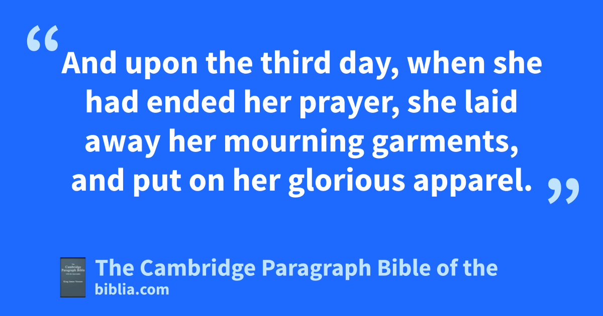 XV. * And upon the third day, when she had ended her prayer, ashe laid away her mourning garments, and put on her glorious apparel. 2 And being gloriously adorned, after she had called upon God, who is the bbeholder and csaviour of all things, she took two dmaids with her: 3 and upon the one she leaned, as carrying herself * daintily; 4 and the other followed, bearing up her train. 5 And she was * ruddy through the perfection of her beauty, and her countenance was cheerful * and very amiable: but her heart was in anguish efor fear. 6 Then having passed through all the doors, she stood before the king, who sat upon his royal throne, and was clothed with all his robes of majesty, all glittering with gold and precious stones; and he was very dreadful. 7 Then lifting up his countenance that shone with majesty, he looked very fiercely upon her: and the queen fell down, and was pale, and hfainted, and bowed herself upon the head of the dmaid that went * before her. 8 Then God changed the spirit of the king into mildness, who * in a fear leaped from his throne, and took her in his arms, till she came to herself again, and comforted her with loving words, and said unto her, 9 Esther, what is the matter? I am fthy brother, be of good cheer: 10 thou shalt not die, though our commandment be * general: come near. 11 And so he held up his golden sceptre, and laid it upon her neck, 12 and embraced her, and said, Speak unto me. 13 Then said she unto him, I saw thee, my lord, gas an angel of God, and my heart was troubled for fear of thy majesty. 14 For wonderful art thou, lord, and thy countenance is full of grace. 15 And as she was speaking, * she fell down for hfaintness. 16 Then the king was troubled, and all his servants comforted her.