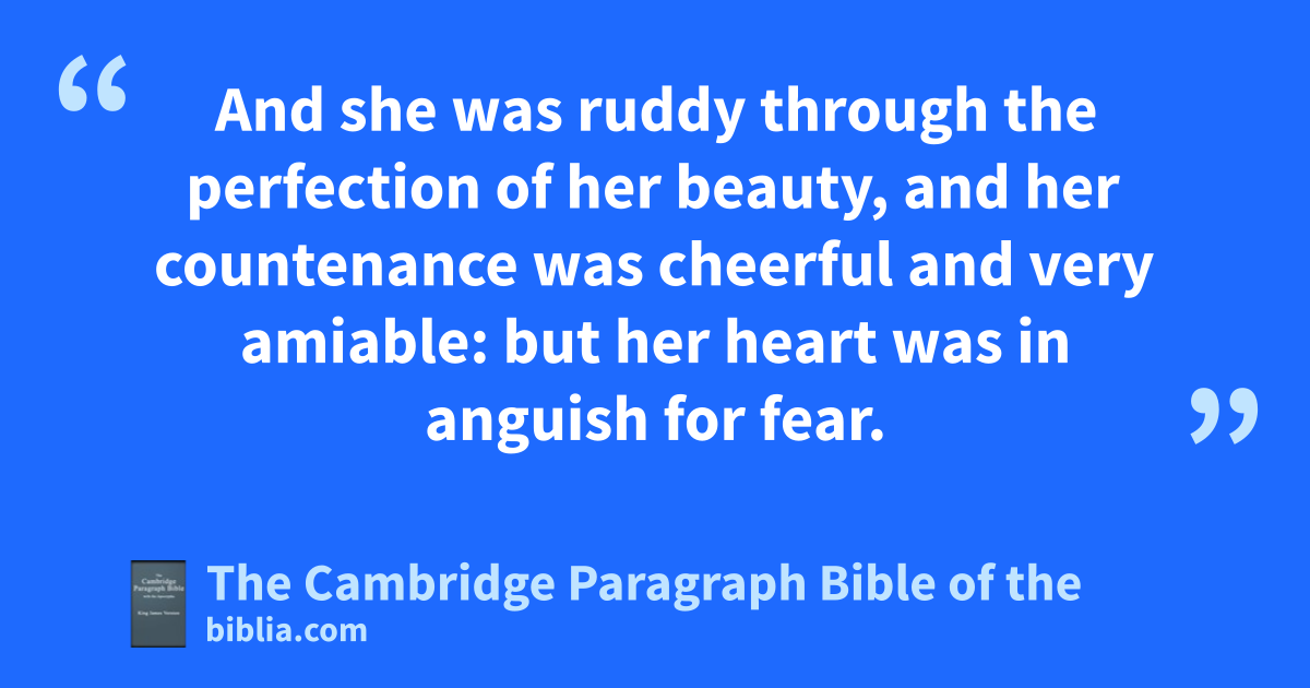 XV. * And upon the third day, when she had ended her prayer, ashe laid away her mourning garments, and put on her glorious apparel. 2 And being gloriously adorned, after she had called upon God, who is the bbeholder and csaviour of all things, she took two dmaids with her: 3 and upon the one she leaned, as carrying herself * daintily; 4 and the other followed, bearing up her train. 5 And she was * ruddy through the perfection of her beauty, and her countenance was cheerful * and very amiable: but her heart was in anguish efor fear. 6 Then having passed through all the doors, she stood before the king, who sat upon his royal throne, and was clothed with all his robes of majesty, all glittering with gold and precious stones; and he was very dreadful. 7 Then lifting up his countenance that shone with majesty, he looked very fiercely upon her: and the queen fell down, and was pale, and hfainted, and bowed herself upon the head of the dmaid that went * before her. 8 Then God changed the spirit of the king into mildness, who * in a fear leaped from his throne, and took her in his arms, till she came to herself again, and comforted her with loving words, and said unto her, 9 Esther, what is the matter? I am fthy brother, be of good cheer: 10 thou shalt not die, though our commandment be * general: come near. 11 And so he held up his golden sceptre, and laid it upon her neck, 12 and embraced her, and said, Speak unto me. 13 Then said she unto him, I saw thee, my lord, gas an angel of God, and my heart was troubled for fear of thy majesty. 14 For wonderful art thou, lord, and thy countenance is full of grace. 15 And as she was speaking, * she fell down for hfaintness. 16 Then the king was troubled, and all his servants comforted her.