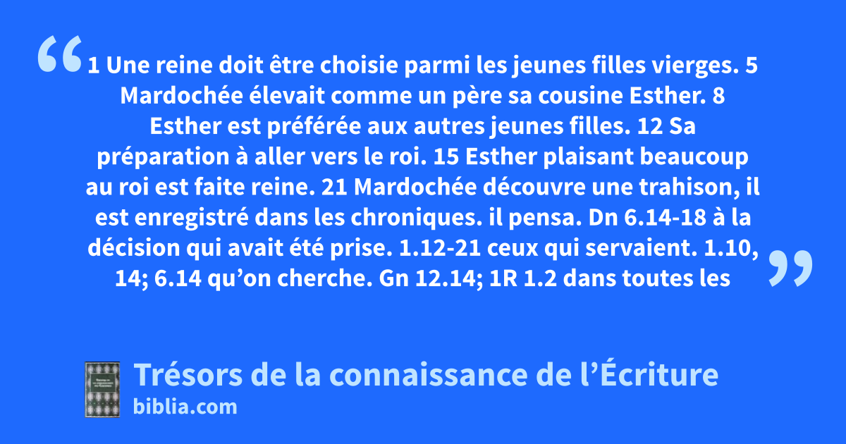 1 Une reine doit être choisie parmi les jeunes filles vierges. 5 Mardochée élevait comme un père sa cousine Esther. 8 Esther est préférée aux autres jeunes filles. 12 Sa préparation à aller vers le roi. 15 Esther plaisant beaucoup au roi est faite reine. 21 Mardochée découvre une trahison, il est enregistré dans les chroniques.