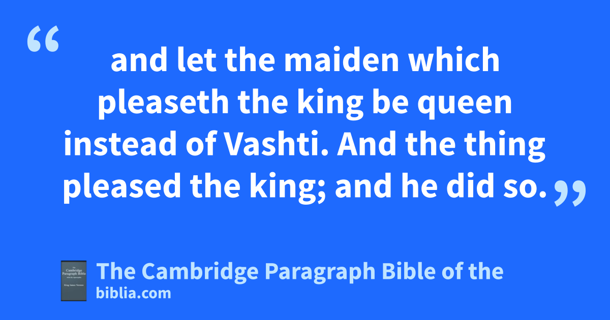 II. * After these things, when the wrath of king Ahasuerus was appeased, he remembered Vashti, and what she had done, and what was adecreed against her. 2 Then said the king’s servants that ministered unto him, Let there be fair young virgins sought for the king: 3 and let the king appoint officers in all the provinces of his kingdom, that they may gather together all the fair young virgins unto Shushan the palace, to the house of the women, * unto the custody of * Hege the king’s chamberlain, keeper of the women; and let their bthings for purification be given them: 4 and let the maiden which pleaseth the king be queen instead of Vashti. And the thing pleased the king; and he did so.