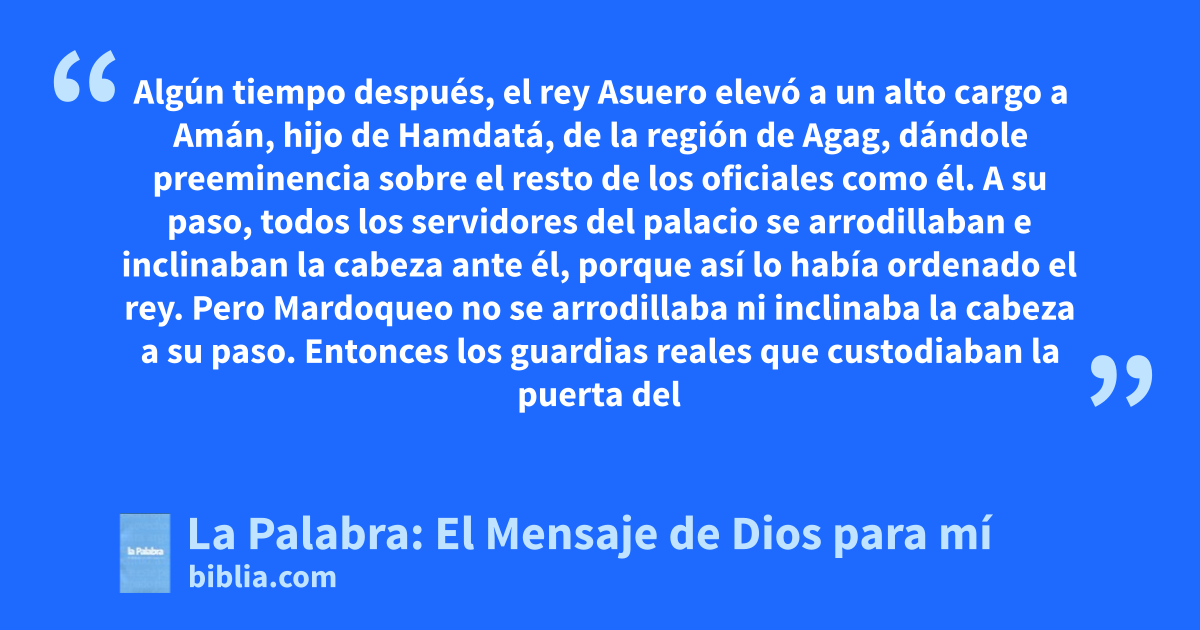 3 Algún tiempo después, el rey Asuero elevó a un alto cargo a Amán, hijo de Hamdatá, de la región de Agag, dándole preeminencia sobre el resto de los oficiales como él. 2 A su paso, todos los servidores del palacio se arrodillaban e inclinaban la cabeza ante él, porque así lo había ordenado el rey. Pero Mardoqueo no se arrodillaba ni inclinaba la cabeza a su paso.