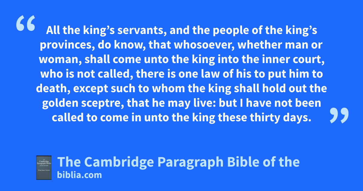 IV. * When Mordecai perceived all that was done, Mordecai arent his clothes, and put on bsackcloth with cashes, and went out into the midst of the city, and cried with a loud and a bitter cry; 2 and came even before the king’s gate: for none might enter into the king’s gate clothed with sackcloth. 3 And in every province, whithersoever the king’s commandment and his decree came, there was great mourning among the Jews, and dfasting, and weeping, and wailing; and * many lay in bsackcloth and cashes. 4 So Esther’s maids and her * chamberlains came and told it her. Then was the queen exceedingly grieved; and she sent raiment to clothe Mordecai, and to take away his sackcloth from him: but he received it not. 5 Then called Esther for eHatach, one of the king’s chamberlains, * whom he had appointed to attend upon her, and gave him a commandment to Mordecai, to know what it was, and why it was. 6 So Hatach went forth to Mordecai unto the street of the city, which was before the king’s gate. 7 And Mordecai told him of all that had happened unto him, and of fthe sum of the money that Haman had promised to pay to the king’s treasuries for the Jews, to destroy them. 8 Also he gave him gthe copy of the writing of the decree that was given at Shushan to destroy them, to shew it unto Esther, and to declare it unto her, and to charge her that she should go in unto the king, to make supplication unto him, and to make request before him for her people. 9 And Hatach came and told Esther the words of Mordecai. 10 Again Esther spake unto Hatach, and gave him commandment unto Mordecai: 11 All the king’s servants, and the people of the king’s provinces, do know, that whosoever, whether man or woman, shall come unto the king into hthe inner court, who is not called, ithere is one law of his to put him to death, except such to whom kthe king shall hold out the golden sceptre, that he may live: but I have not been called to come in unto the king these thirty days. 12 And they told to Mordecai Esther’s words. 13 Then Mordecai commanded to answer Esther, Think not with thyself that thou shalt escape in the king’s house, more than all the Jews. 14 For if thou altogether holdest thy peace at this time, then shall there * enlargement and deliverance arise to the Jews from another place; but thou and thy father’s house shall be destroyed: and who knoweth whether thou art come to the kingdom for such a time as this? 15 Then Esther bade them return Mordecai this answer: 16 Go, gather together all the Jews that are * present in Shushan, and fast ye for me, and neither eat nor drink lthree days, night or day; I also and my maidens will fast likewise; and so will I go in unto the king, which is not according to the law: and mif I perish, I perish. 17 So Mordecai * went his way, and did according to all that Esther had commanded him.