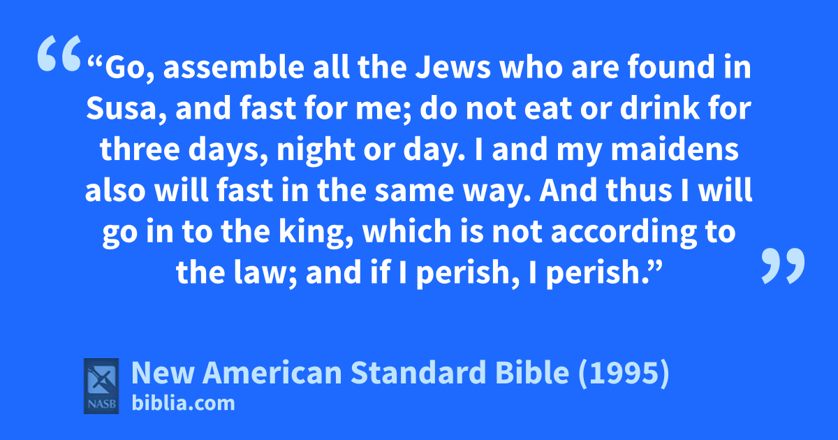 16 “Go, assemble all the Jews who are found in Susa, and fast for me; ado not eat or drink for bthree days, night or day. I and my maidens also will fast in the same way. And thus I will go in to the king, which is not according to the law; and if I perish, I perish.”