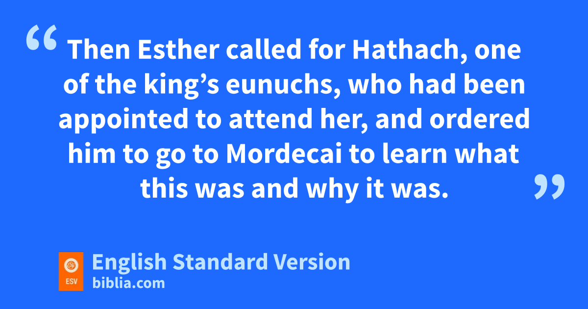 4 When Esther’s young women and her eunuchs came and told her, the queen was deeply distressed. She sent garments to clothe Mordecai, so that he might take off his sackcloth, but he would not accept them. 5 Then Esther called for Hathach, one of the king’s eunuchs, who had been appointed to attend her, and ordered him to go to Mordecai to learn what this was and why it was. 6 Hathach went out to Mordecai in the open square of the city in front of the king’s gate, 7 and Mordecai told him all that had happened to him, rand the exact sum of money that Haman had promised to pay into the king’s treasuries for the destruction of the Jews. 8 Mordecai also gave him sa copy of the written decree issued in Susa for their destruction,1 that he might show it to Esther and explain it to her and command her to go to the king to beg his favor and plead with him2 on behalf of her people. 9 And Hathach went and told Esther what Mordecai had said. 10 Then Esther spoke to Hathach and commanded him to go to Mordecai and say, 11 “All the king’s servants and the people of the king’s provinces know that if any man or woman goes to the king inside tthe inner court without being called, uthere is but one law—to be put to death, except the one vto whom the king holds out the golden scepter so that he may live. But as for me, I have not been called to come in to the king these thirty days.”