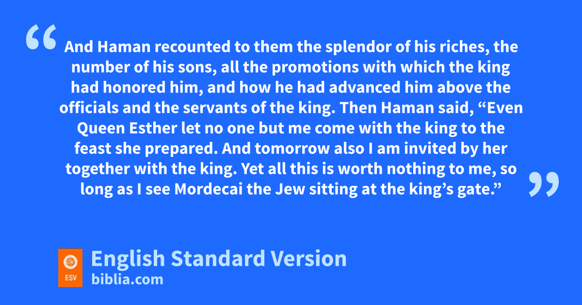 9 And Haman went out that day hjoyful and glad of heart. But when Haman saw Mordecai iin the king’s gate, jthat he neither rose nor trembled before him, he was filled with wrath against Mordecai. 10 Nevertheless, Haman restrained himself and went home, and he sent and brought his friends and khis wife Zeresh. 11 And Haman recounted to them the splendor of his riches, lthe number of his sons, all the promotions with which mthe king had honored him, and how he had advanced him above the officials and the servants of the king. 12 Then Haman said, “Even Queen Esther let no one but me come with the king to the feast she prepared. And tomorrow also I am invited by her together with the king. 13 Yet all this is worth nothing to me, so long as I see Mordecai the Jew sitting iat the king’s gate.” 14 Then khis wife Zeresh and all his friends said to him, n“Let a gallows4 fifty cubits5 high be made, and in the morning tell the king to have Mordecai hanged upon it. Then go joyfully with the king to the feast.” This idea pleased Haman, and he had the gallows made.
