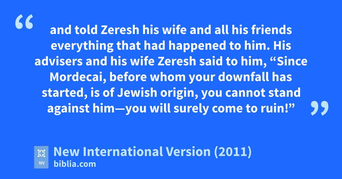 His advisers and his wife Zeresh said to him, “Since Mordecai, before whom your downfalll has started, is of Jewish origin, you cannot stand against him—you will surely come to ruin!”m 14 While they were still talking with him, the king’s eunuchs arrived and hurried Haman away to the banquetn Esther had prepared.